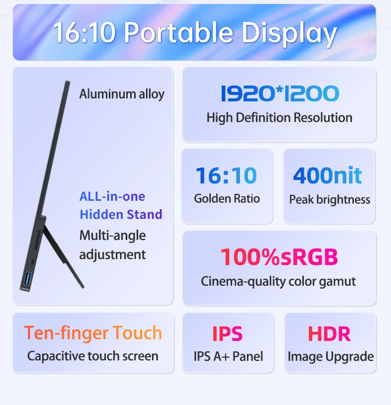 16inch Portable Monitor 1920*1200P Touch Screen 100% SRGB Gaming Computer Display for Steam Deck Laptop Switch PS4 PS5 Xbox