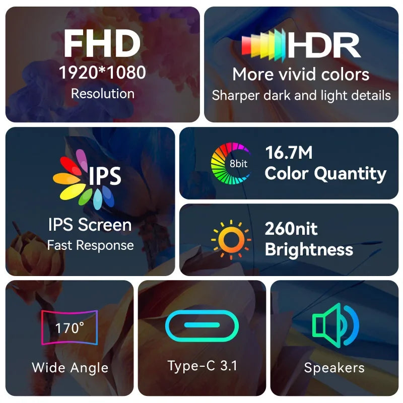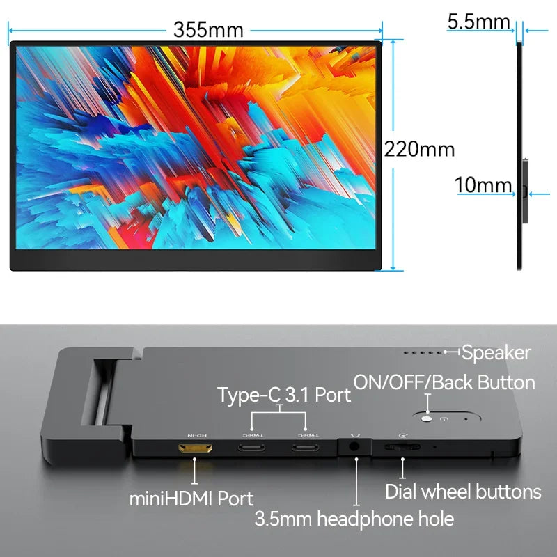 With 1920*1080 high resolution, This portable screen shows clear picture quality, letting you be immersed in it. IPS 178° viewing angle, bringing you a wider visual feast. 800:1 contrast ratio, the screen color contrast is clear and rich in color. The matte screen can effectively improve the reflection effect, which can protect your eyes from being tired even after long hours of looking at the screen.